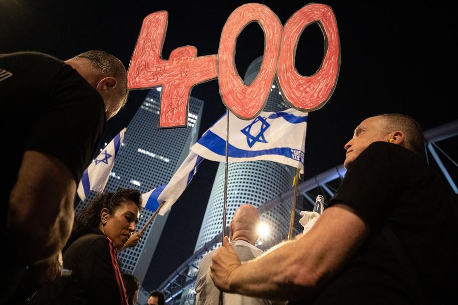 People attend a rally calling for an immediate ceasefire in Gaza and Lebanon as well as the release of Israeli hostages held in Gaza, in Tel Aviv, Israel, Nov. 9, 2024. (Xinhua/Chen Junqing)