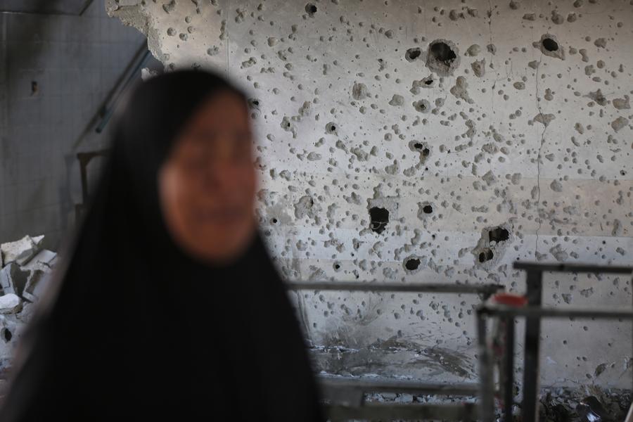 A Palestinian woman is seen at a school housing displaced people in Nuseirat camp in the central Gaza Strip after an Israeli attack, Oct. 14, 2024. (Photo by Marwan Dawood/Xinhua)