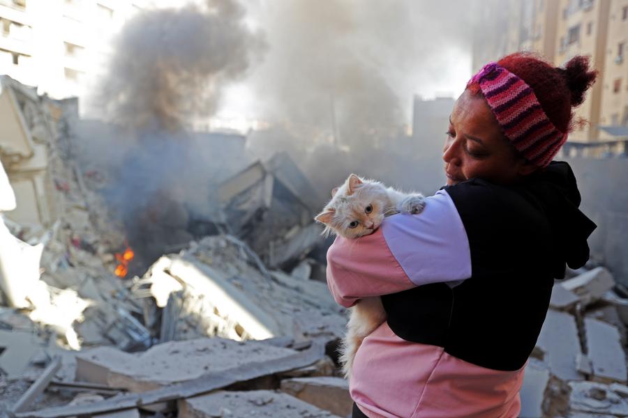 A woman holding a cat is pictured near ruins after Israeli airstrikes in the southern suburbs of Beirut, Lebanon, Oct. 2, 2024. (Xinhua/Bilal Jawich)