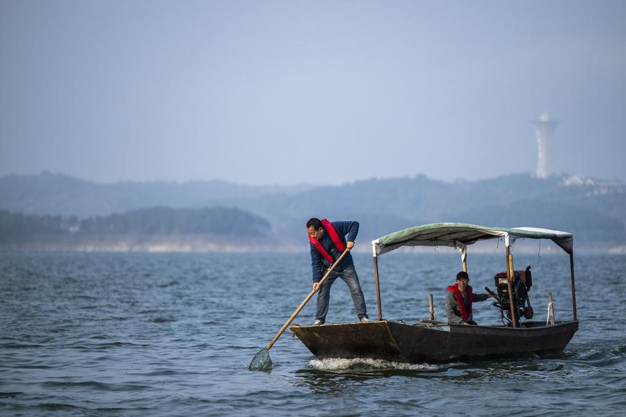 A staff member of a municipal cleanup team removes floating objects at the Danjiangkou Reservoir in central China's Hubei Province, Oct. 28, 2024. (Xinhua/Wu Zhizun)