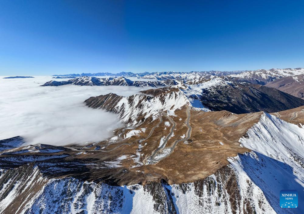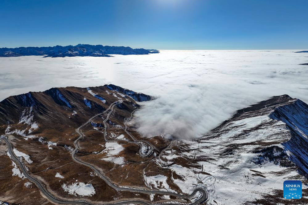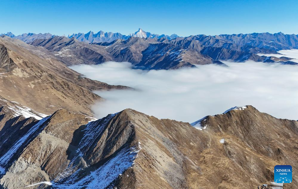 An aerial panoramic photo taken on Dec. 25, 2024 shows the cloud-shrouded Jiajin Mountain in Xiaojin County, Aba Tibetan and Qiang Autonomous Prefecture, southwest China's Sichuan Province. (Xinhua/Wang Xi)