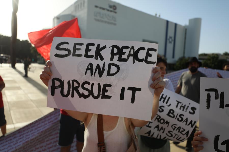 People take part in a demonstration in demand of an immediate ceasefire in Gaza and a deal for the release of the remaining hostages held by Hamas in Tel Aviv, Israel, on July 25, 2024. (Photo by Jamal Awad/Xinhua)
