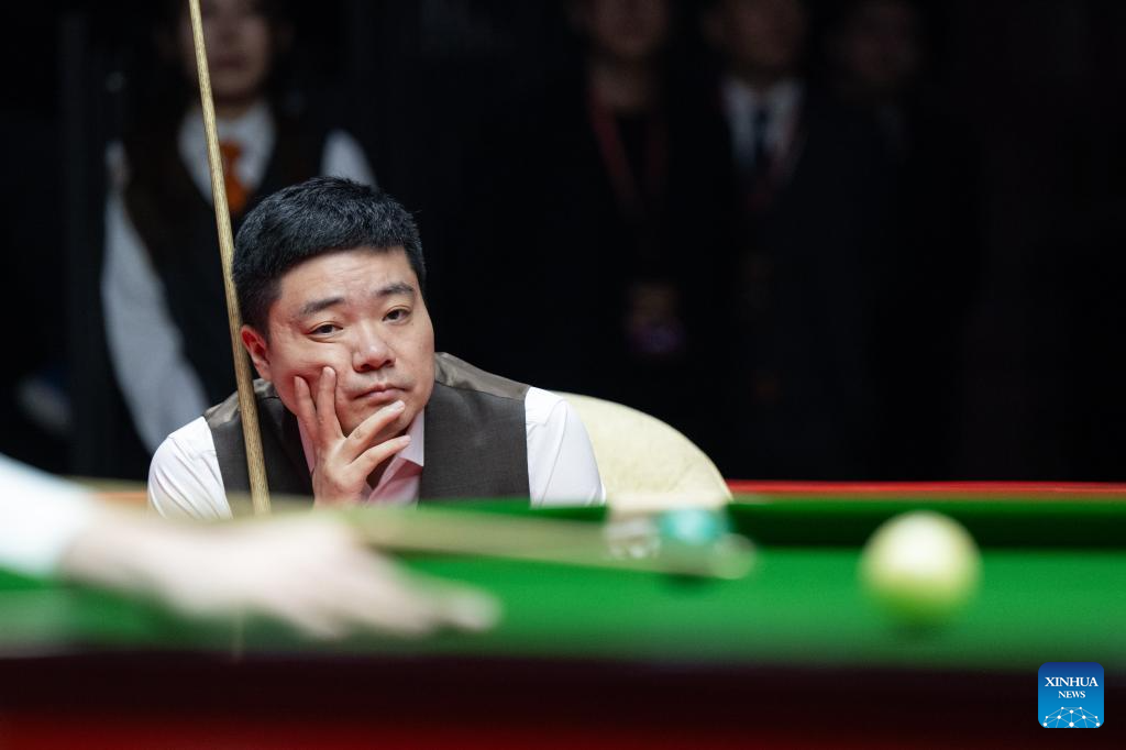 Ding Junhui of China reacts during the match against Judd Trump of England at 2024 Macao Snooker Masters in south China's Macao, Dec. 25, 2024. (Xinhua/Cheong Kam Ka)