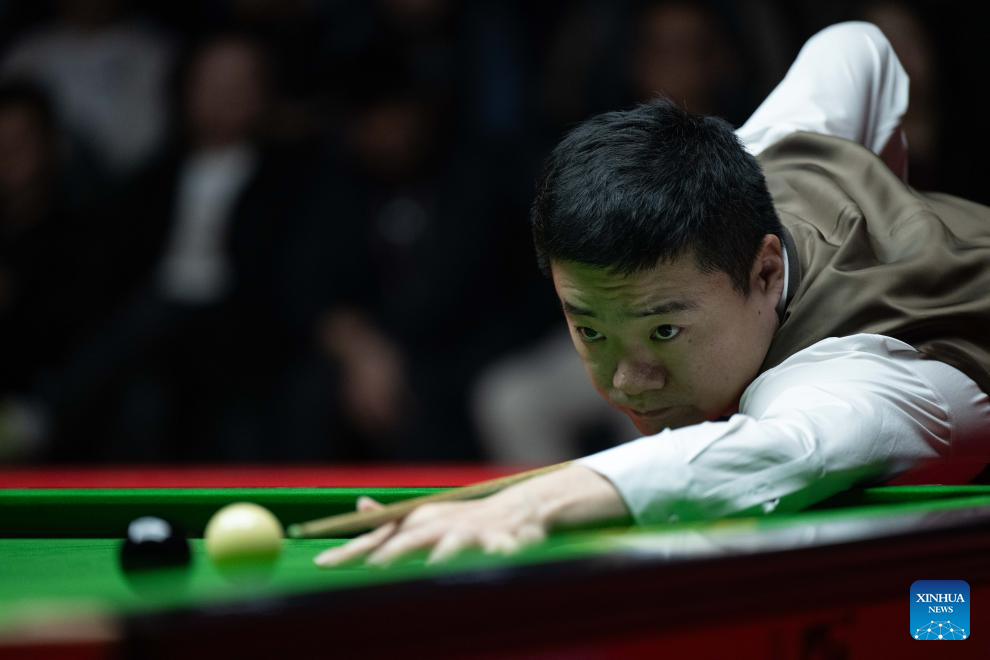 Ding Junhui of China plays a shot during the match against Judd Trump of England at 2024 Macao Snooker Masters in south China's Macao, Dec. 25, 2024. (Xinhua/Cheong Kam Ka)