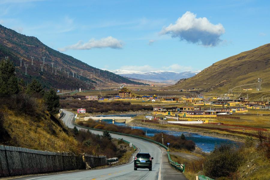 A vehicle moves on the National Highway 317 (coded G317) in Garze Tibetan Autonomous Prefecture, southwest China's Sichuan Province, Nov. 1, 2024. (Xinhua/Shen Bohan)