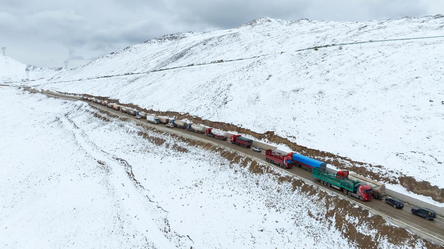 An aerial drone photo taken on Nov. 6, 2024 shows vehicles waiting on the National Highway 318 (coded G318) in Zongang, southwest China's Xizang Autonomous Region. (Xinhua/Shen Bohan)