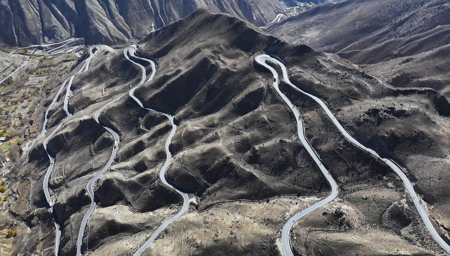 An aerial drone photo taken on Nov. 16, 2024 shows part of Nujiang River zigzag road on the Sichuan-Xizang Highway in Baxoi County, southwest China's Xizang Autonomous Region. (Xinhua/Kelsang Namgyai)