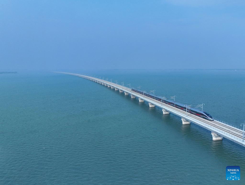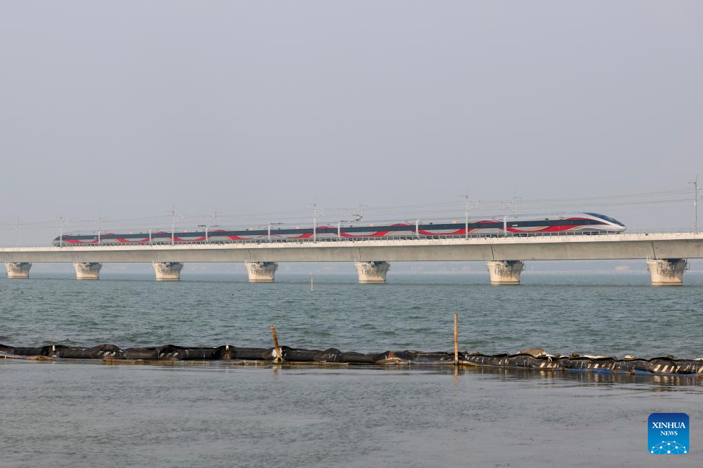 A train passes through the Yuandang Lake section of the Shanghai-Suzhou-Huzhou high-speed railway on Dec. 26, 2024. (Xinhua/Wang Xiang)