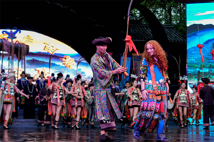 A US student performs ethnic singing and dancing with local youth in Xijiang Qianhu Miao Village, Guizhou province, on Sept 9. (Photo/Xinhua)