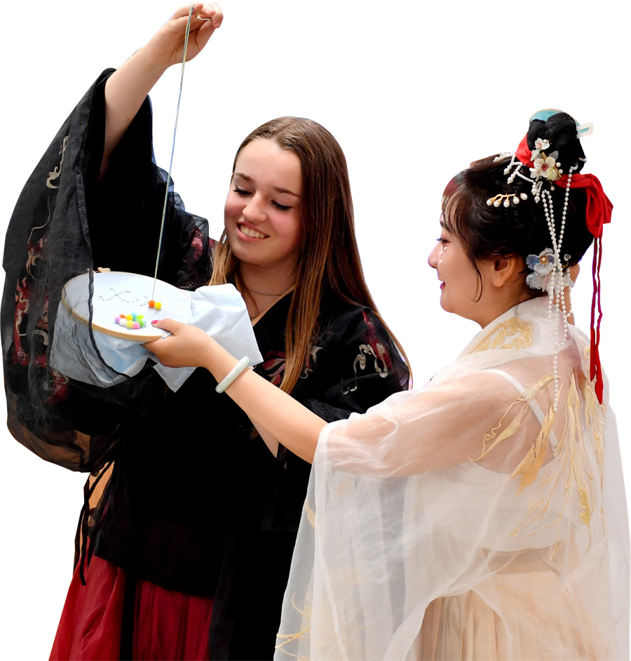 A US student experiences Qixi traditions during a cultural event at a high school in Shijiazhuang, Hebei province, in August. (Photo/Xinhua)