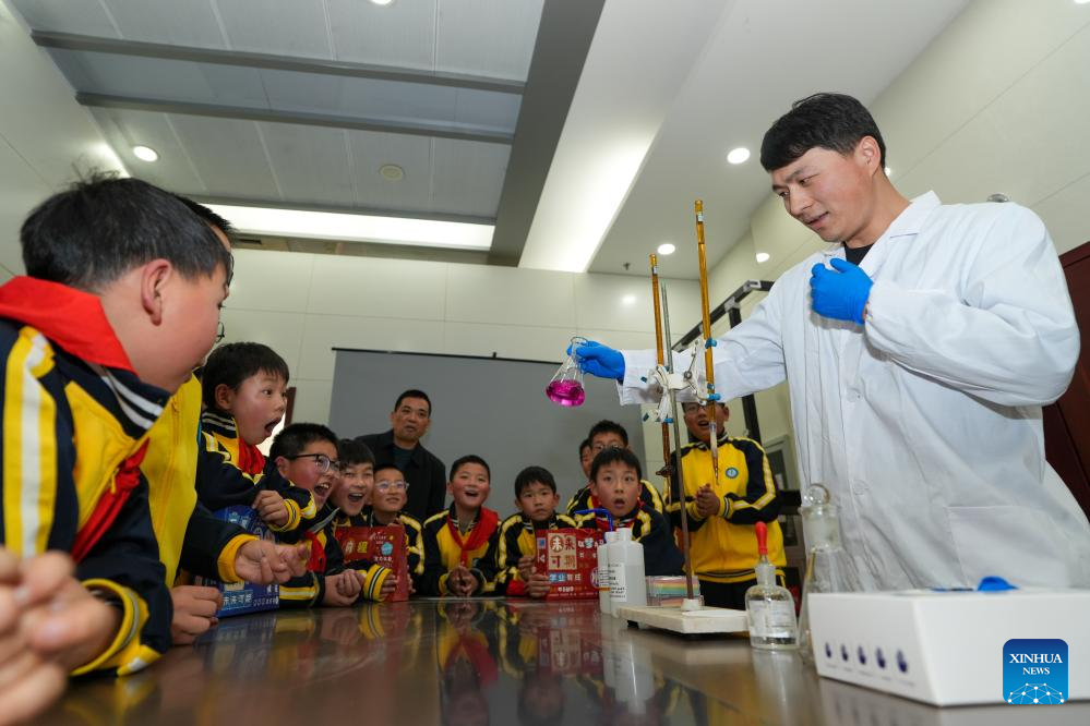 Students watch an experiment during a safety education session in Yangzhou, east China's Jiangsu Province, Dec. 26, 2024. Several departments in Yangzhou jointly carried out safety education and publicity activities for primary and secondary school students, enhancing their safety awareness and improving their safety prevention skills. (Xinhua/Li Bo)