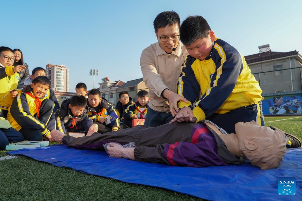 Students participate in a first aid drill for an electric shock during a safety education session in Yangzhou, east China's Jiangsu Province, Dec. 26, 2024. Several departments in Yangzhou jointly carried out safety education and publicity activities for primary and secondary school students, enhancing their safety awareness and improving their safety prevention skills. (Xinhua/Li Bo)