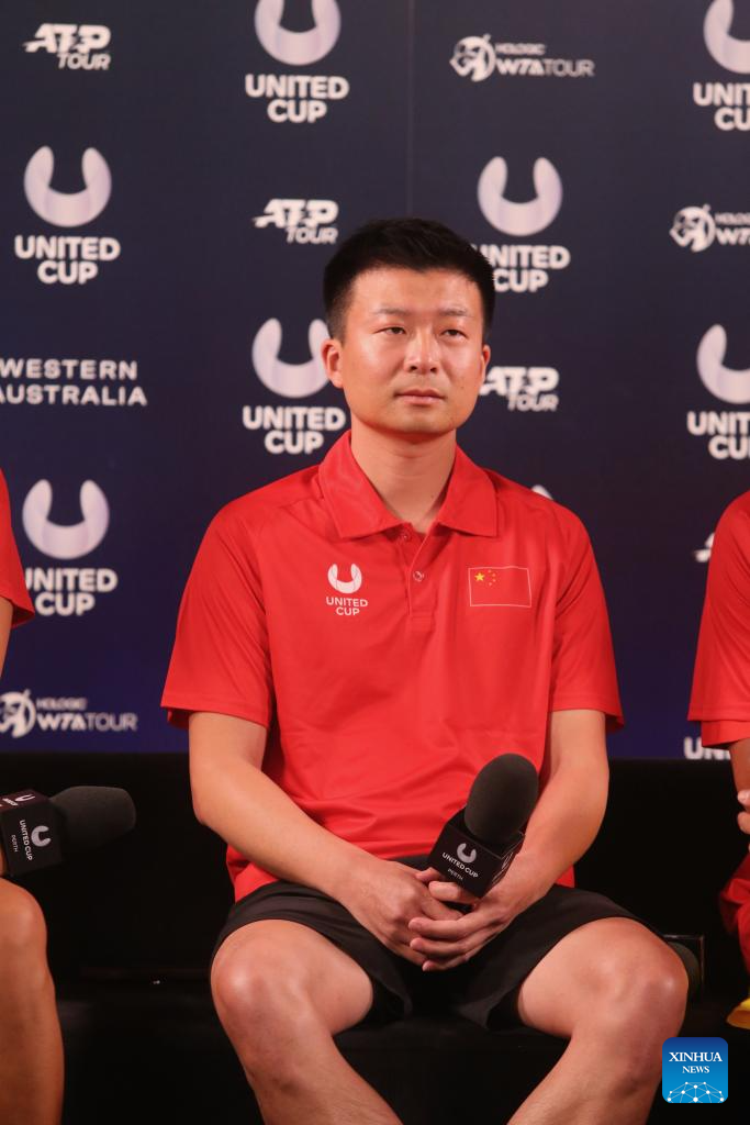 Wu Di (L) of China speaks during the media conference of the United Cup Perth at RAC Arena in Perth, Australia, Dec. 26, 2024. (Photo by Zhou Dan/Xinhua)