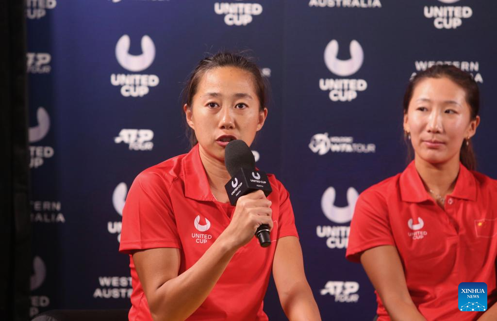 Zhang Shuai (L) of China speaks during the media conference of the United Cup Perth at RAC Arena in Perth, Australia, Dec. 26, 2024. (Photo by Zhou Dan/Xinhua)