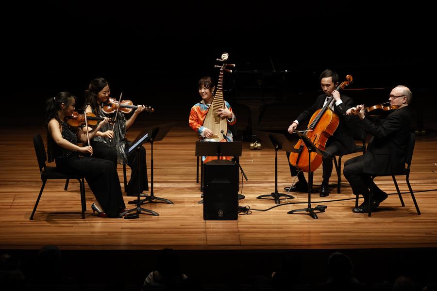 Prominent pipa virtuoso Wu Man (R, Front) performs with members of the Bard East/West Ensemble during the opening concert of the sixth annual China Now Music Festival at Rose Theater at Jazz at Lincoln Center in New York, the United States, on Oct. 4, 2023. (Xinhua/Li Rui)