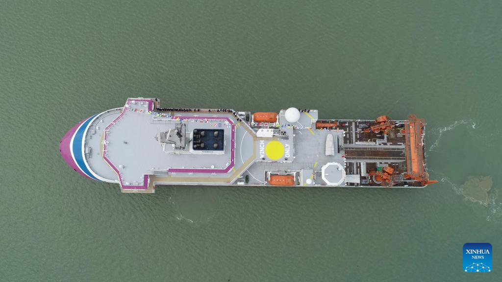 The 104-meter-long self-developed and built vessel has a displacement of around 10,000 tonnes, an endurance of 15,000 nautical miles and a crew capacity of 80. It is equipped with two-direction ice-breaking capabilities at both the bow and stern. (Xinhua/Zhao Yingquan)