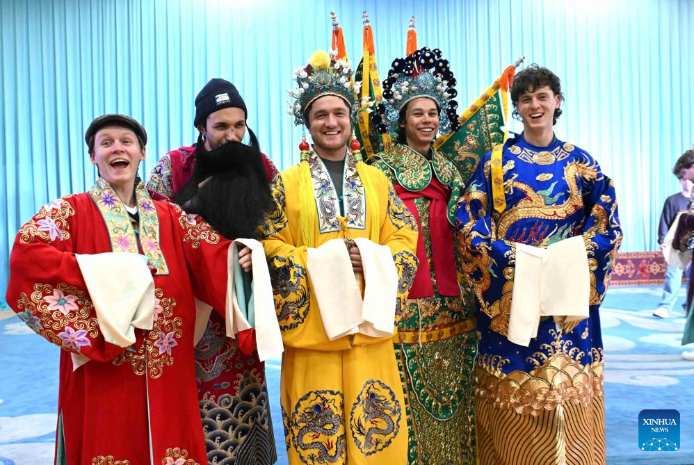 U.S. college students pose for photos in Peking Opera costumes in Shijiazhuang, north China's Hebei Province, Dec. 30, 2024. At the invitation of Shijiazhuang Foreign Language School, a group of U.S. teachers and students visit Shijiazhuang from Dec. 25 to Dec. 31. (Photo by Chen Qibao/Xinhua)