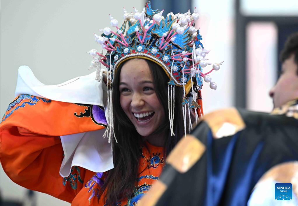 A U.S. college student tries a set of Peking Opera costumes in Shijiazhuang, north China's Hebei Province, Dec. 30, 2024. At the invitation of Shijiazhuang Foreign Language School, a group of U.S. teachers and students visit Shijiazhuang from Dec. 25 to Dec. 31. (Photo by Chen Qibao/Xinhua)