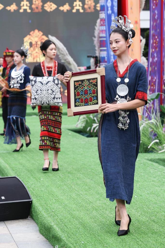 Actors display local cultural and creative products during an ethnic fashion show in Wuzhishan, south China's Hainan Province, Dec. 29, 2024. (Xinhua/Zhang Liyun)