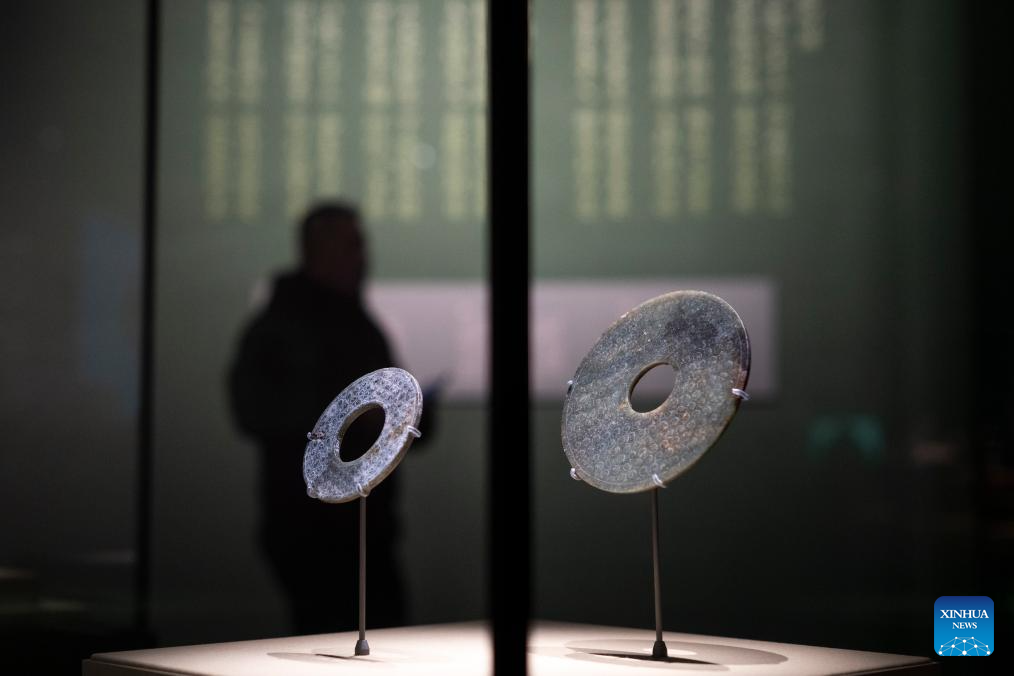 This photo taken on Dec. 31, 2024 shows a set of jade ware on display at the exhibition "A Panorama of Hubei" in Wuhan, central China's Hubei Province. The exhibition opened here on Tuesday, showcasing the history and culture of Hubei in both ancient and modern times. (Xinhua/Wu Zhizun)