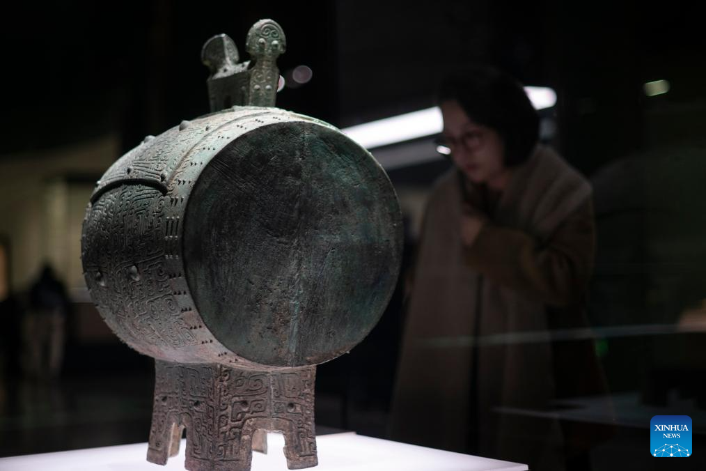 This photo taken on Dec. 31, 2024 shows a bronze drum on display at the exhibition "A Panorama of Hubei" in Wuhan, central China's Hubei Province. The exhibition opened here on Tuesday, showcasing the history and culture of Hubei in both ancient and modern times. (Xinhua/Wu Zhizun)
