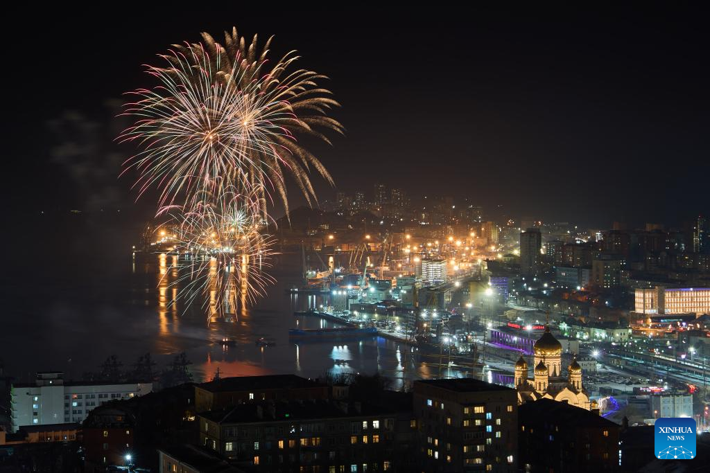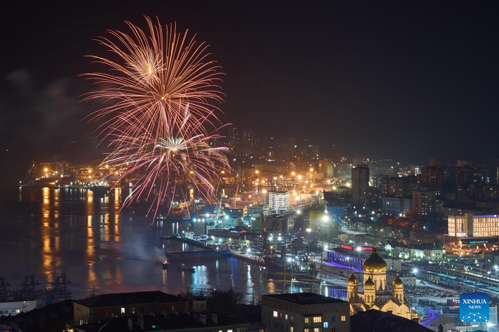 Fireworks explode in the sky in celebration of the New Year in Vladivostok, Russia, Dec. 31, 2024. (Photo by Guo Feizhou/Xinhua)
