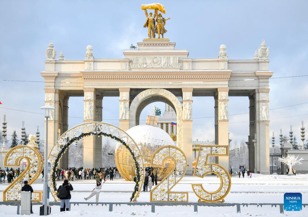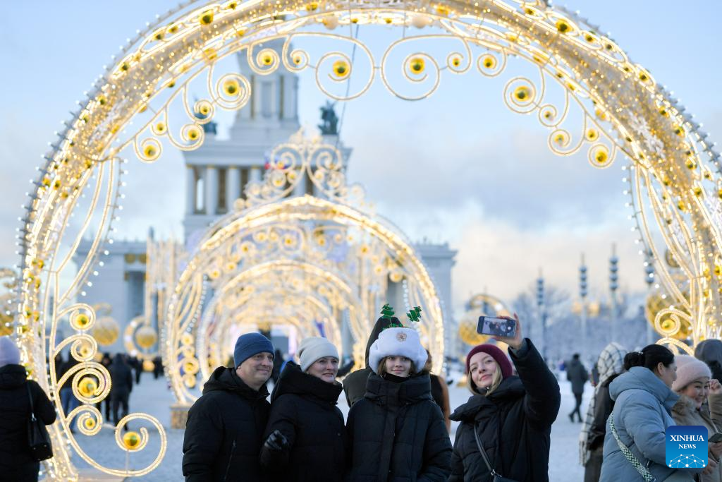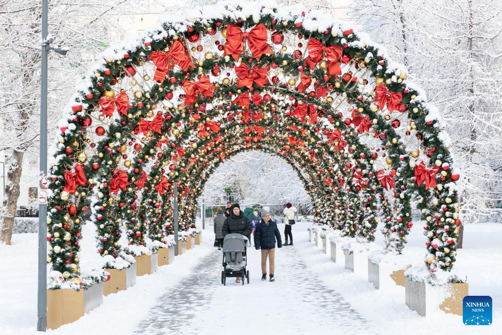 People walk under New Year decorations in Moscow, Russia, on Dec. 31, 2024. (Xinhua/Bai Xueqi)