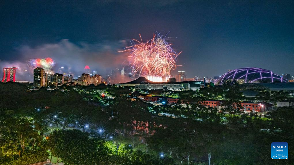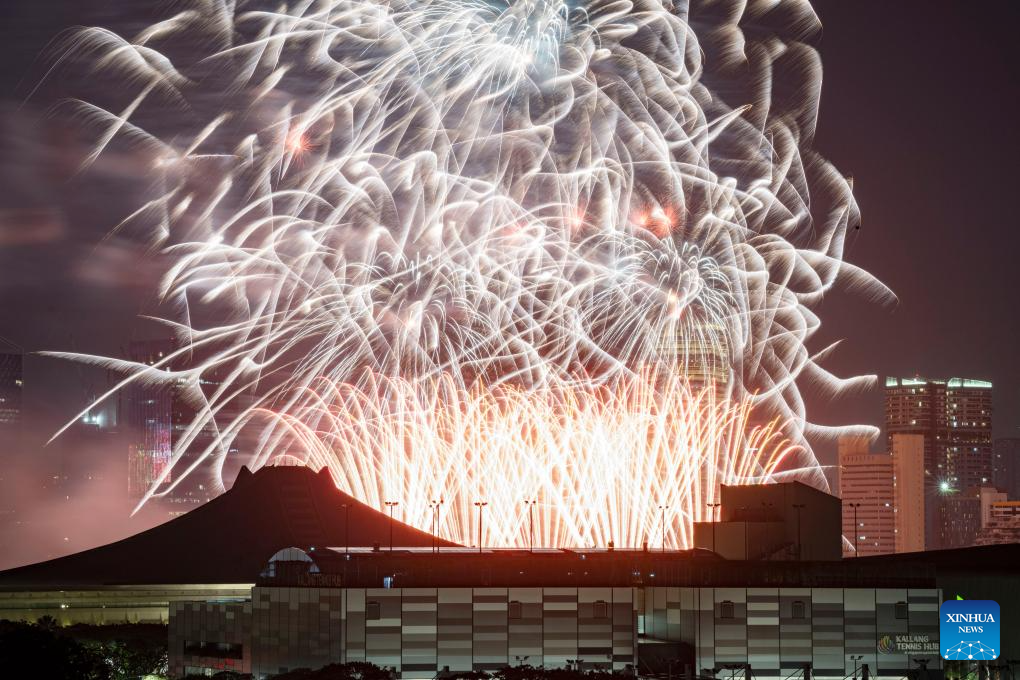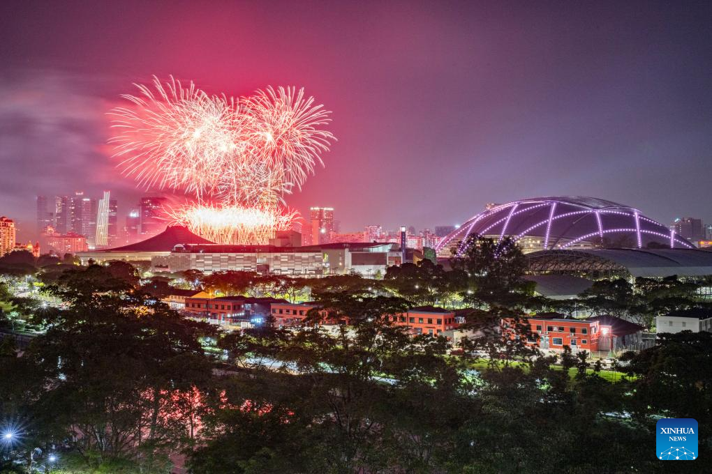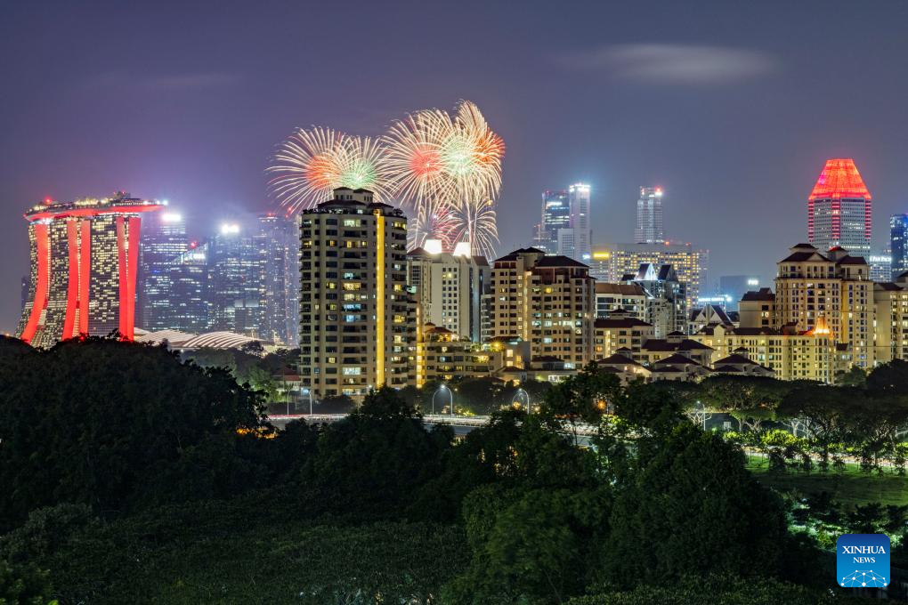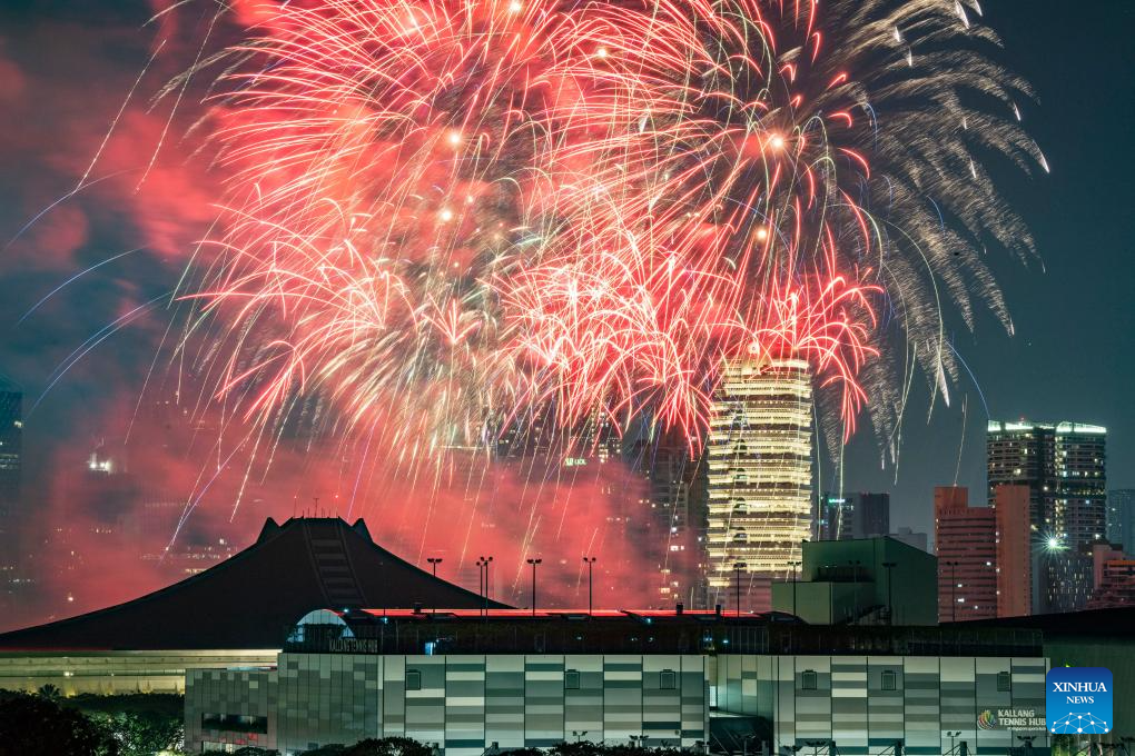 Fireworks explode over Kallang Basin to celebrate the New Year in Singapore, on Jan. 1, 2025. (Photo by Then Chih Wey/Xinhua)