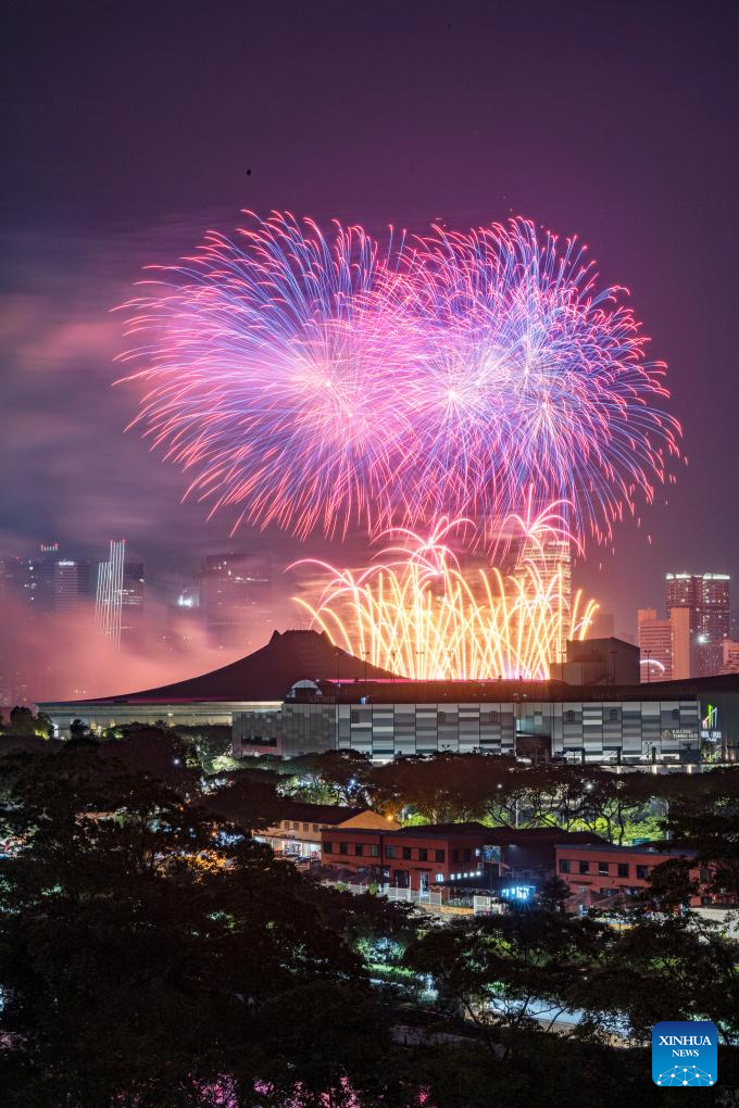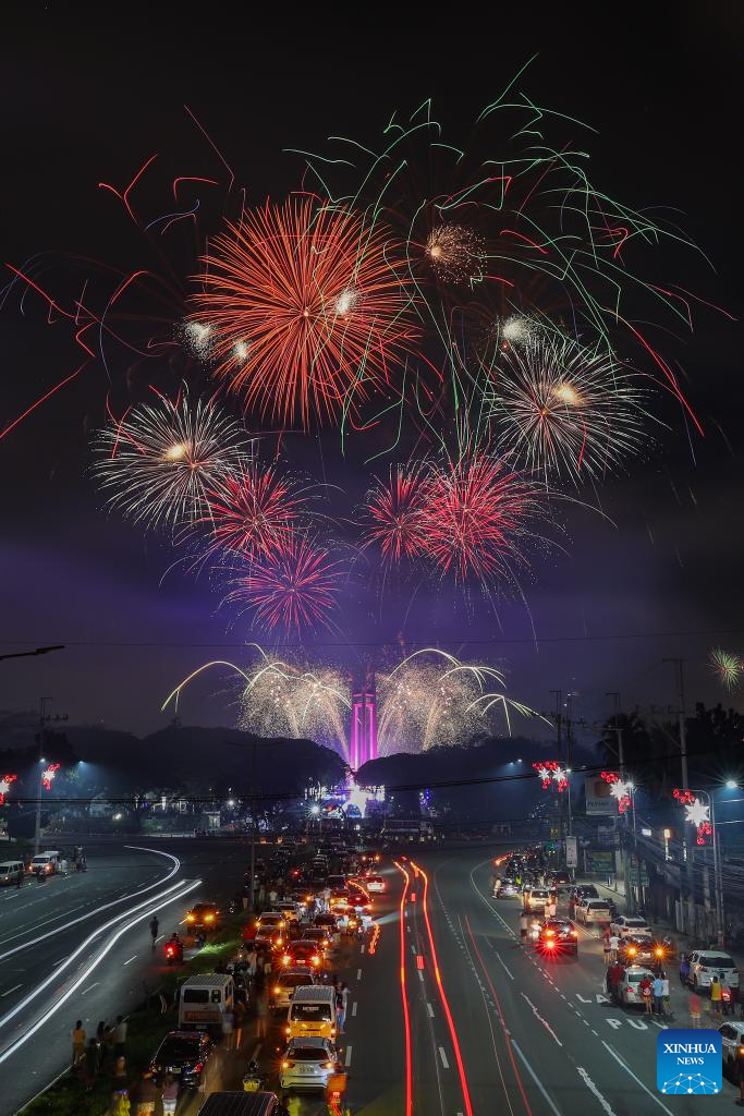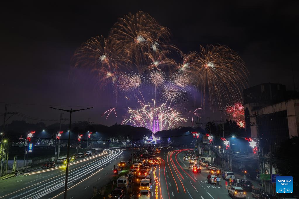 Fireworks explode to celebrate the New Year over Quezon City Memorial Circle in Quezon City, the Philippines, on Jan. 1, 2025. (Xinhua/Rouelle Umali)