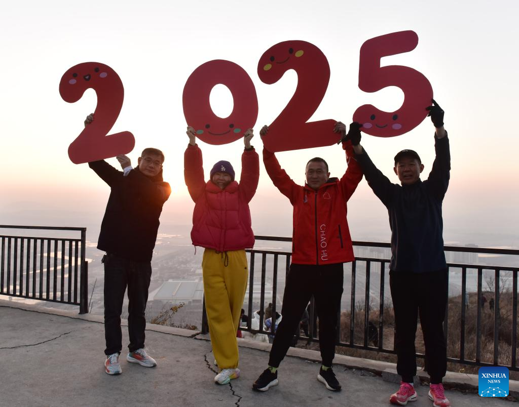 People holding cards of the number 2025 pose for photos at sunrise in Chaohu City, east China's Anhui Province, Jan. 1, 2025. (Photo by Ma Fengcheng/Xinhua)