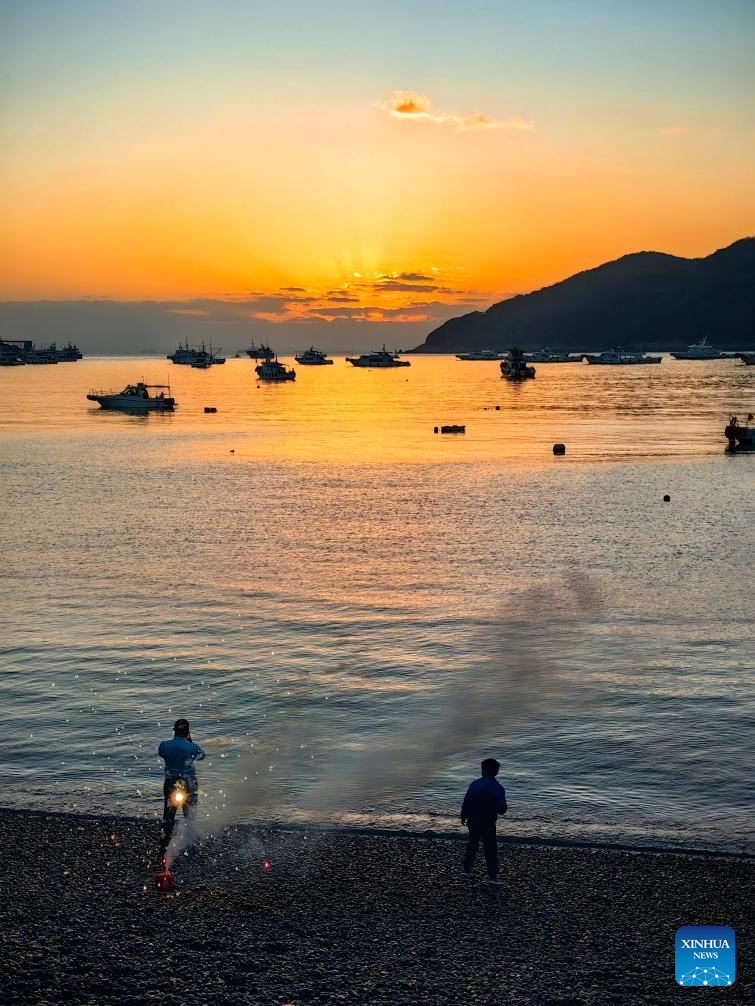 People watch the rising sun at seaside in Rui'an, east China's Zhejiang Province, Jan. 1, 2025. (Photo by Zhuang Yingchang/Xinhua)
