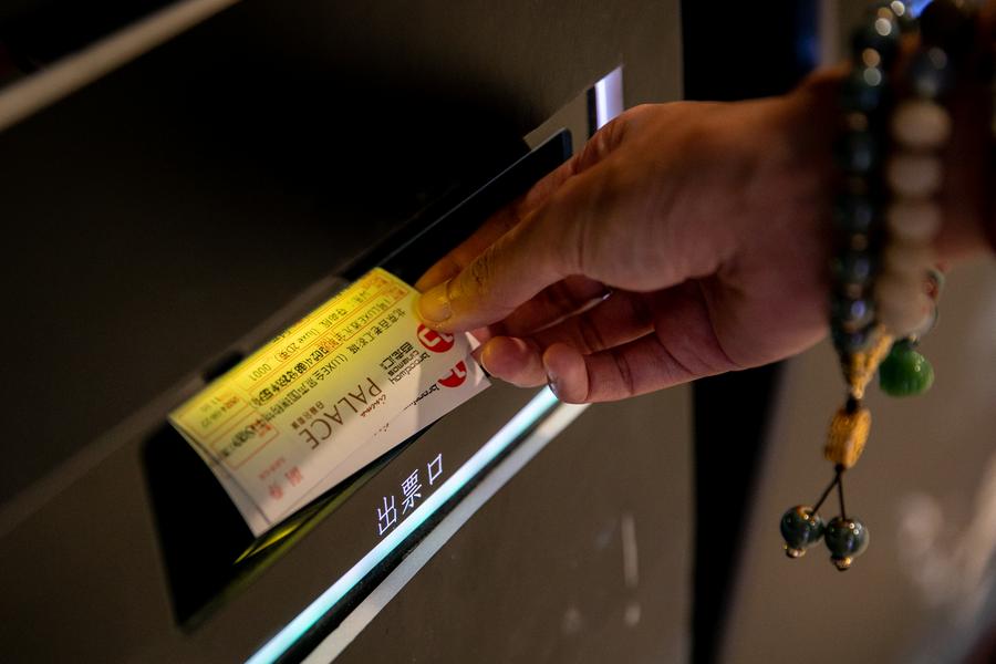 A movie-goer claims tickets from a self-service machine at a cinema in Beijing, capital of China, Aug. 22, 2024. (Xinhua/Chu Jiayin)