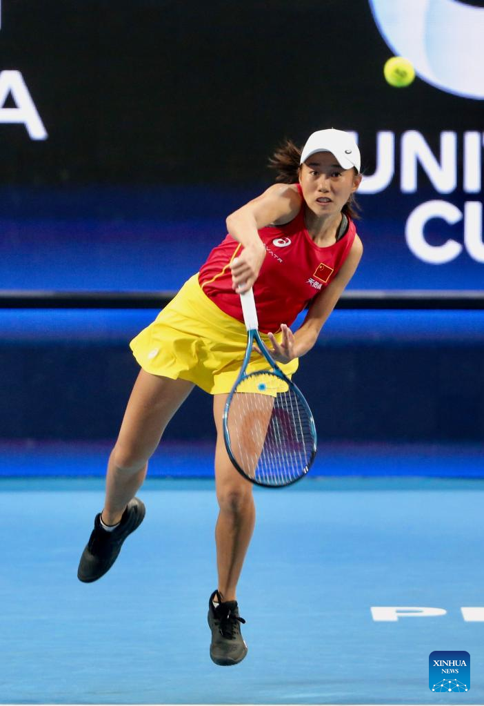 Zhang Shuai of China hits a return during the women's singles match against Coco Gauff of the United States in the quarterfinal between China and the United States at the 2025 United Cup tennis tournament in Perth, Australia, Jan. 1, 2025. (Xinhua/Ma Ping)