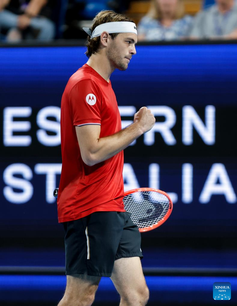 Taylor Fritz of the United States celebrates scoring during the men's singles match against Zhang Zhizhen of China in the quarterfinal between China and the United States at the 2025 United Cup tennis tournament in Perth, Australia, Jan. 1, 2025. (Xinhua/Ma Ping)