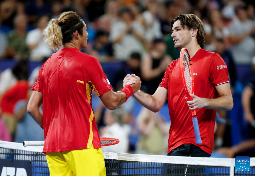Taylor Fritz (R) of the United States greets Zhang Zhizhen of China after their men's singles match in the quarterfinal between China and the United States at the 2025 United Cup tennis tournament in Perth, Australia, Jan. 1, 2025. (Xinhua/Ma Ping)