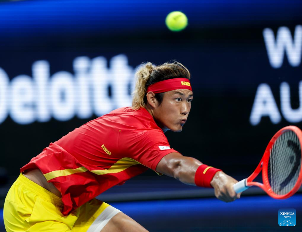 Zhang Zhizhen of China hits a return during the men's singles match against Taylor Fritz of the United States in the quarterfinal between China and the United States at the 2025 United Cup tennis tournament in Perth, Australia, Jan. 1, 2025. (Xinhua/Ma Ping)