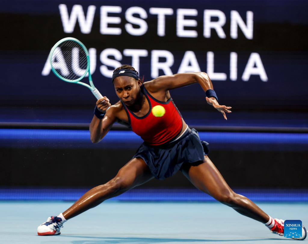 Coco Gauff of the United States hits a return during the women's singles match against Zhang Shuai of China in the quarterfinal between China and the United States at the 2025 United Cup tennis tournament in Perth, Australia, Jan. 1, 2025. (Xinhua/Ma Ping)
