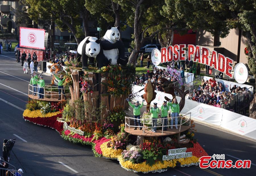 A float with two pandas atop a wooded forest travels down Colorado Boulevard in Pasadena, California, the United States, Jan 1, 2025. (China News Service/Zhang Shuo)