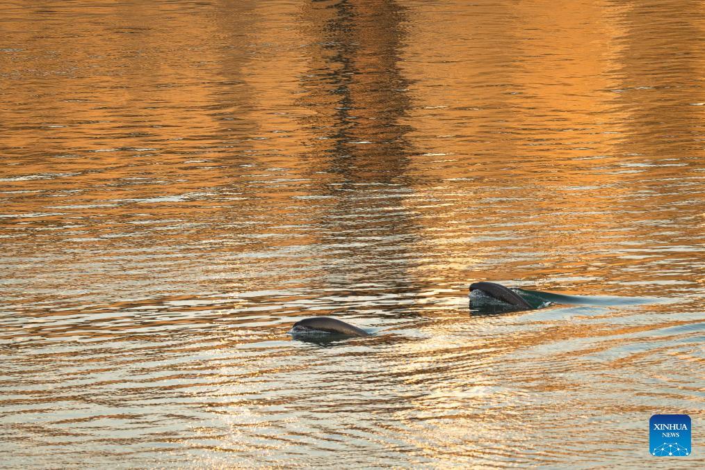 This photo taken on Jan. 5, 2025 shows Yangtze finless porpoises swimming near the lower reaches of the Gezhouba Dam in Yichang City, central China's Hubei Province. The Yangtze finless porpoise is a national first-class protected wild animal and its population status serves as a "barometer" of the ecological environment of the Yangtze River. In recent years, the population of the species here has increased steadily as systematic ecological restoration efforts were implemented. (Xinhua/Xiao Yijiu)