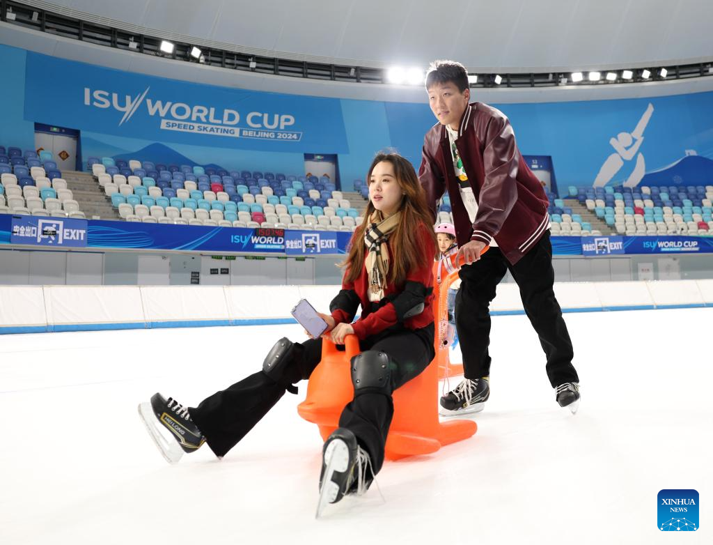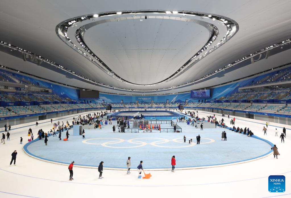 People have fun with ice and snow at National Speed Skating Oval in Beijing