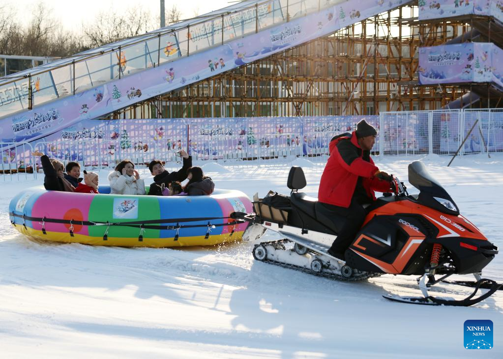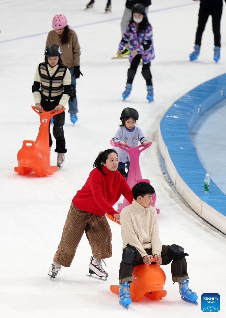People enjoy themselves at the National Speed Skating Oval in Beijing, capital of China, Jan. 4, 2025. People flocked to the National Speed Skating Oval to have fun with ice and snow during the weekend. (Xinhua/Zhang Chenlin)