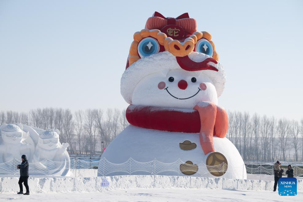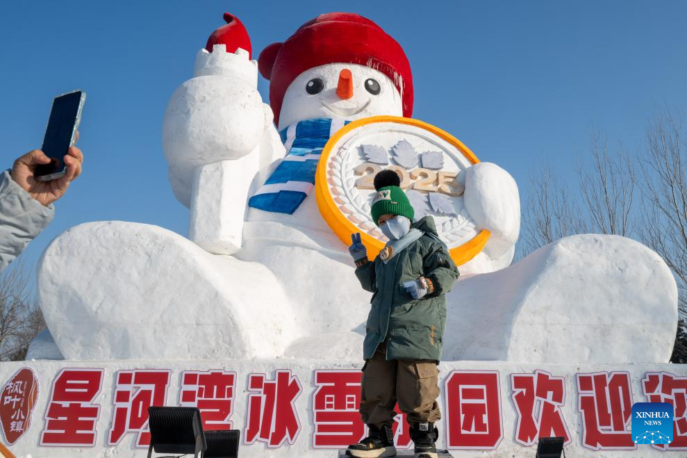 People pose for photos with a snowman at a farm of Beidahuang Group in Harbin, capital of northeast China's Heilongjiang Province, Jan. 4, 2025. Harbin, with many snow sculptures across the city, has emerged as one of China's top winter travel destinations, attracting tourists from around the globe. (Xinhua/Zhang Tao)