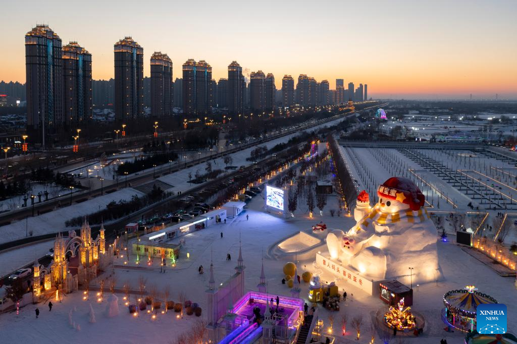 People have fun among snowmen in front of a shopping mall in Harbin, capital of northeast China's Heilongjiang Province, Jan. 3, 2025. Harbin, with many snow sculptures across the city, has emerged as one of China's top winter travel destinations, attracting tourists from around the globe. (Xinhua/Xie Jianfei)