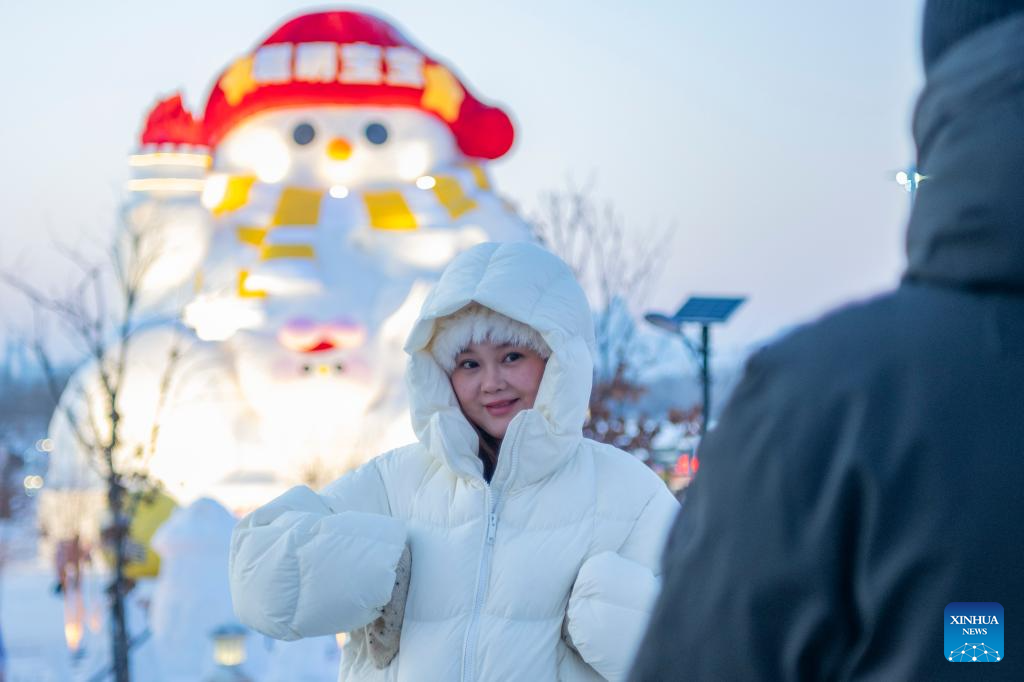People pose for photos with snowmen "Dongdong" and "Beibei" in Harbin, capital of northeast China's Heilongjiang Province, Jan. 3, 2025. Harbin, with many snow sculptures across the city, has emerged as one of China's top winter travel destinations, attracting tourists from around the globe. (Xinhua/Xie Jianfei)