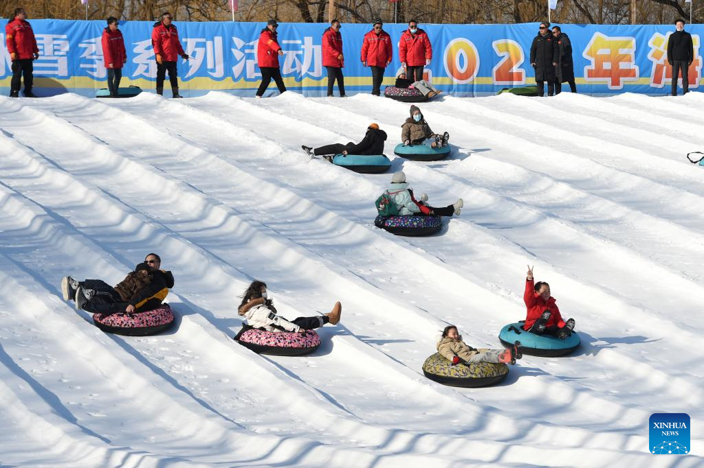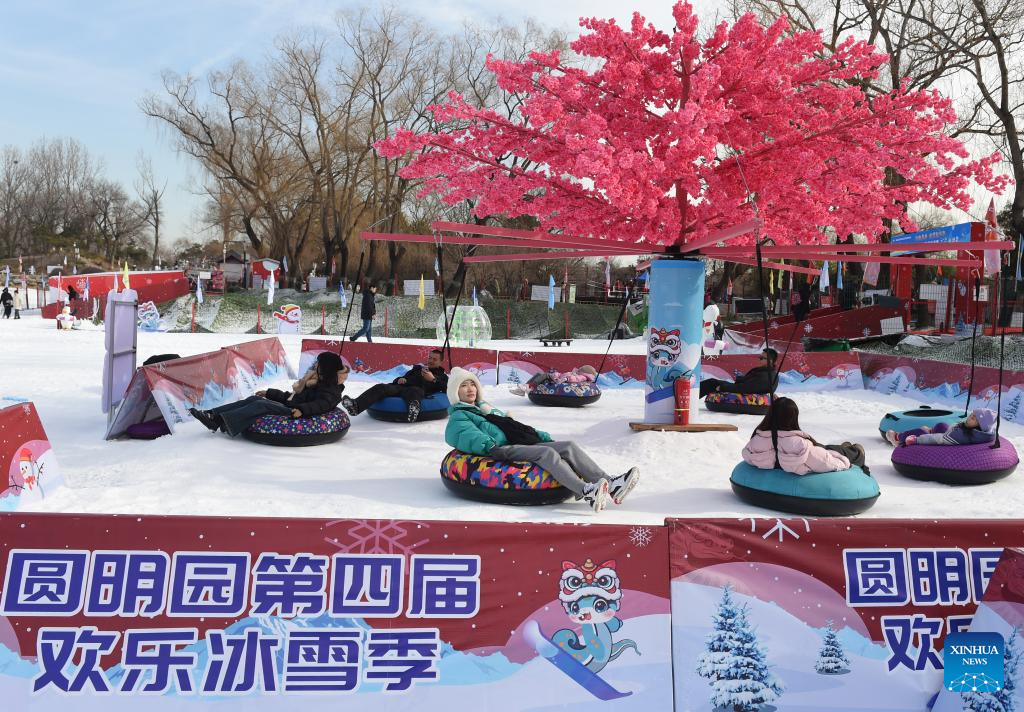 Visitors enjoy snow tubing at Yuanmingyuan Park in Beijing, capital of China, Jan. 4, 2025. The ice and snow festival of Yuanmingyuan Park kicked off on Saturday. (Xinhua/Luo Xiaoguang)