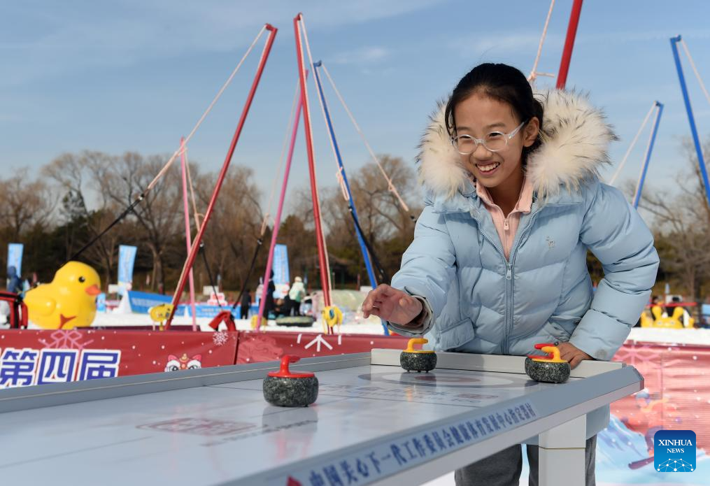 A visitor tries table curling at Yuanmingyuan Park in Beijing, capital of China, Jan. 4, 2025. The ice and snow festival of Yuanmingyuan Park kicked off on Saturday. (Xinhua/Luo Xiaoguang)