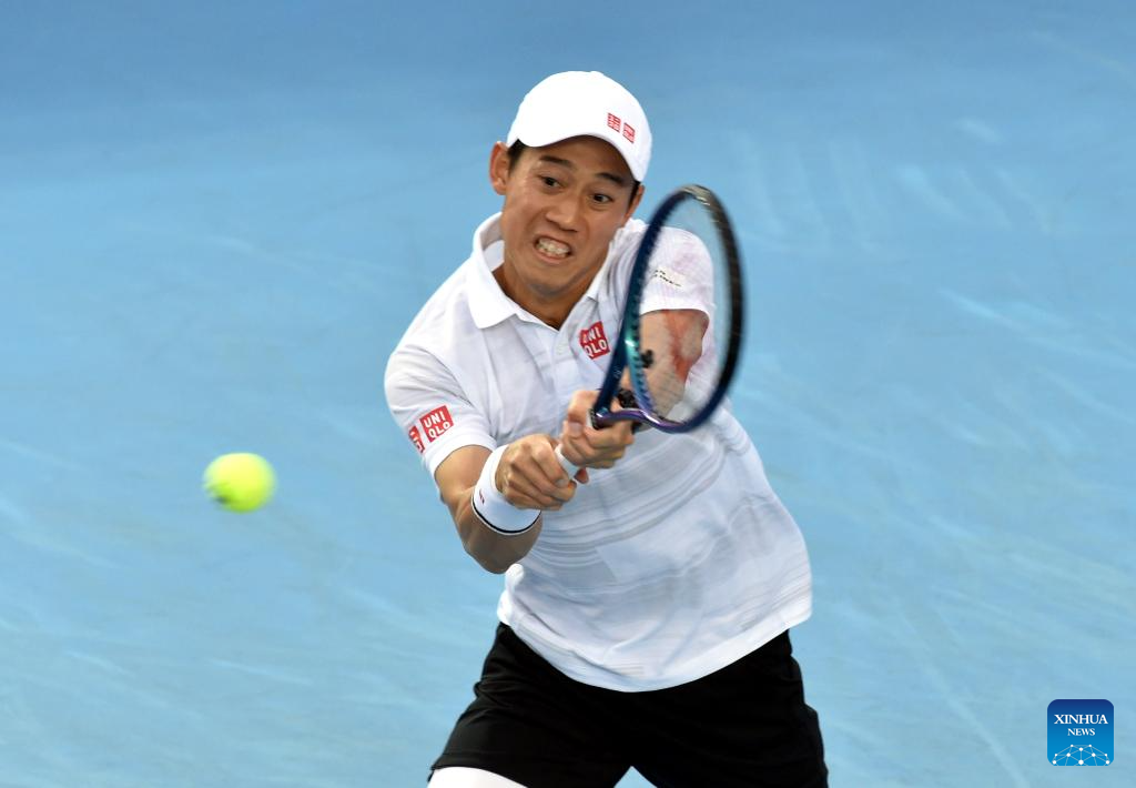 Nishikori Kei hits a return during the semifinal between Shang Juncheng of China and Nishikori Kei of Japan at the ATP250 Hong Kong Tennis Open in Hong Kong, south China, Jan. 4, 2025. (Photo by Lo Ping Fai/Xinhua)