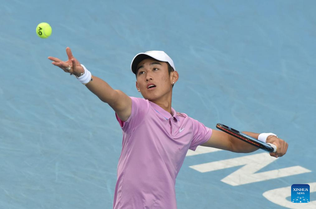 Shang Juncheng serves during the semifinal between Shang Juncheng of China and Nishikori Kei of Japan at the ATP250 Hong Kong Tennis Open in Hong Kong, south China, Jan. 4, 2025. (Photo by Lo Ping Fai/Xinhua)