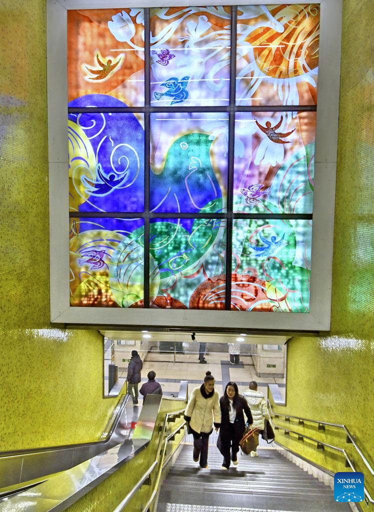 This photo taken on Jan. 1, 2025 shows glass artwork at Lincuiqiao Station on Beijing Subway Line 8 in Beijing, capital of China. (Xinhua/Li Xin)