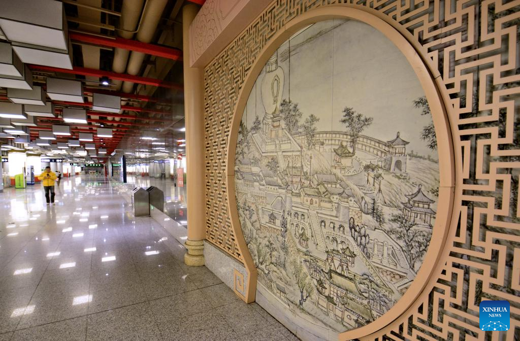 This photo taken on Jan. 4, 2025 shows decorative artwork with Chinese traditional style at Ping'anli Station on Beijing Subway Line 19 in Beijing, capital of China. (Xinhua/Li Xin)